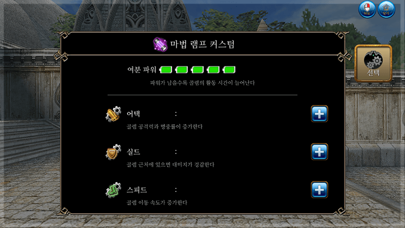 | 어택 강화 | 마법 램프를 개량해 어택 효과를 향상시킨다 어택 배분당 강화치가 증가한다 또한 배분에 관계없이 명중률이 항상 증가한다 |