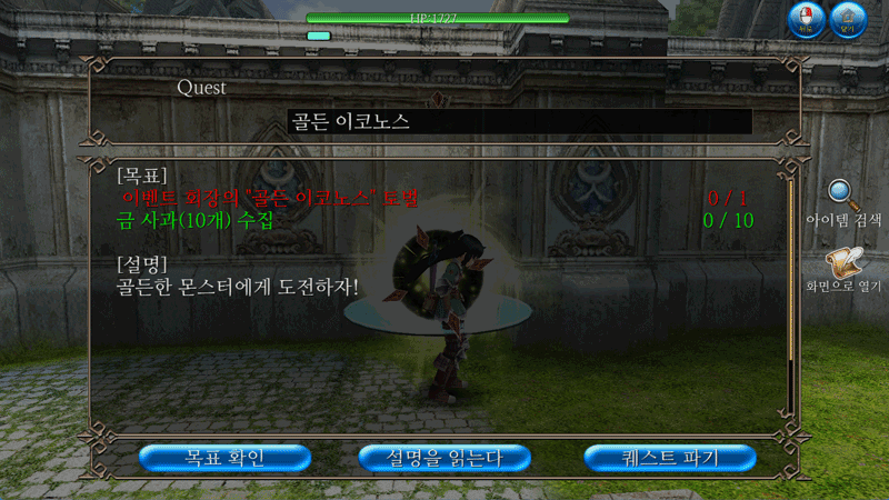 한정 퀘스트 명 참가 조건 [Lv 75]골든 이코노스 황금 사과 10개 [Lv 150]행운의 개구리 황금 사과 10개 [Lv 225]골젬 황금 사과 10개 [Lv 300]황금 주먹 황금 사과 10개 New [Lv 320]오럼 포터황금 사과 10개
