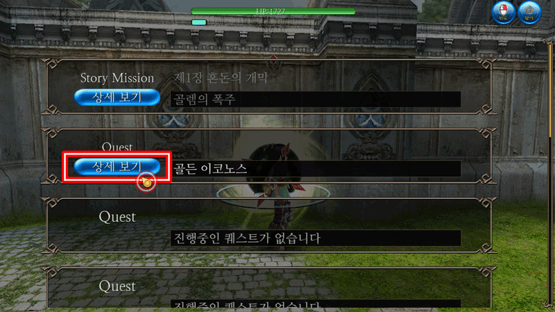 퀘스트 상세는 [캐릭터 > 퀘스트 > 상세 보기 ]를 선택하면 확인할 수 있습니다.